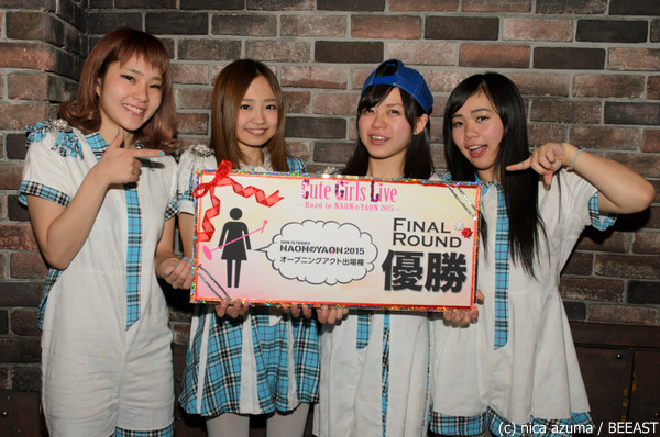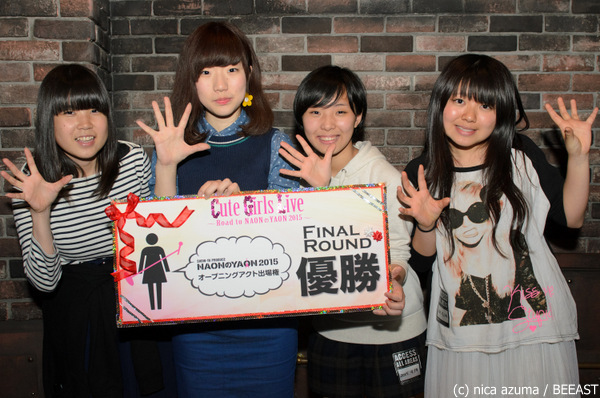4月29日(水・祝)に日比谷野外音楽堂にて開催されるNAONのYAON 2015。そのオープニングアクトを目指すオーディション「Cute Girls Live」のファイナルラウンドが本日・4月19日(日)に下北沢GARDENにて開催され、インディーズ部門ではSORAMIMIがグランプリを獲得。軽音部部門では青空サイダーとみかづきも。の2組が同時にグランプリを獲得した。