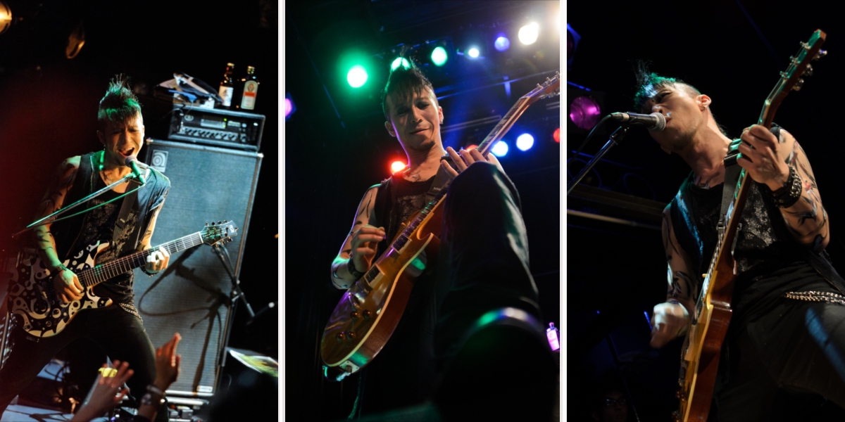 Before putting out a last spurt toward the end of the show, kansei drank Jack Daniel’s in a single gulp just like enlivenment, which was common for fade’s shows. “Tokyo! Are you having fun?”, kansei talked friendly and vigorously to the audiences on the floor as usual. As he started to drink, godo’s guitar sounded thrillingly just like agitating kansei’s feeling and further pumping up the stage, with noriyuki and rui’s rhythm leading to excitement.