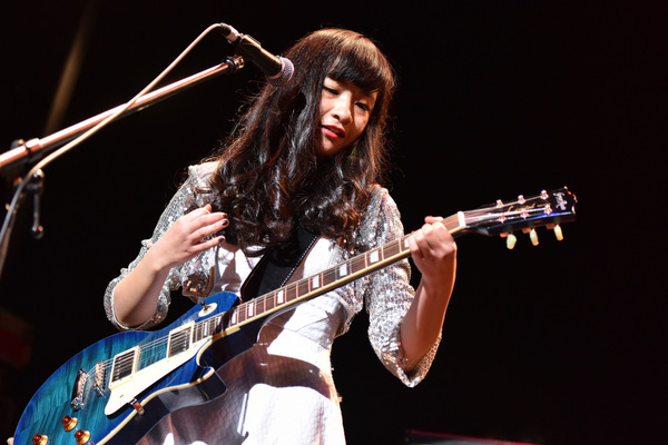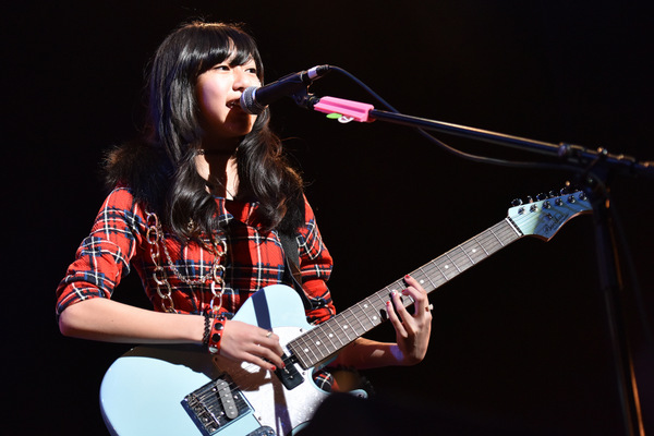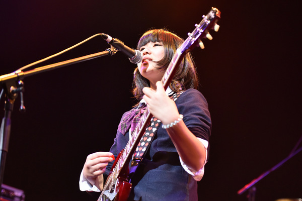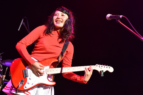 揃いの赤チェック衣装で各々定位置につくと、1曲目はスローテンポなあったかい楽曲、「筑後川」。トリプルギター&ベース&ドラム&パーカッション&キーボードの肉厚なサウンドで観客の心をつかむ。YOSHIKA(Guitar & Vocal)がアコギ、LEONA(Guitar & Vocal)がエレキであったかさを表現。そこにハットがおしゃれなキーボーディストNATSUKO(Keyboard & Vocal)、元気いっぱいにパーカッションを叩くAOI(Percussion & Vocal)、黒光りするグレッチを巧みに操るMIZUHO(Guitar & Vocal)…と、KANA(Bass)とPIPPI(Drums)のリズム隊を除く5人が代わる代わるボーカルを務めるから面白い。