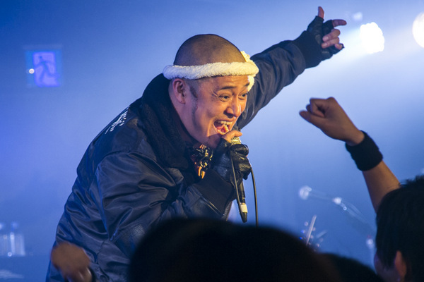 この規模のライブハウスにしては不釣合いなほどの爆音が響き渡る中、表公演は早くも山場に差し掛かる。「男達の挽歌~ミソジヨソジオヤジエレジー~」「バカポジション」を畳みかけ、しばらくイベントなどでは披露されていなかったTHE冠のライブ名物ともいえる「エビバディ炎」では”あんたもう44やで~”という叫びで絶妙な哀愁と軽妙な語りをきかせ、「帰郷」では嫁と両親の板挟みになる中年の哀しさを切々とシャウトで歌い上げる。