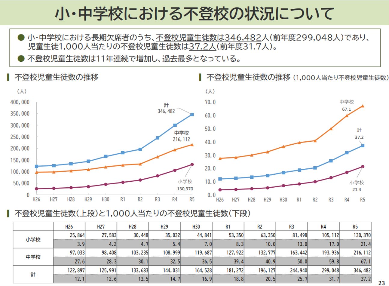 小中学生の不登校が社会問題となっている。文部科学省によると令和5年度の小中学校の不登校児童・生徒は34万6482人と、11年連続で増加し過去最多を更新し続けている。小学校では1クラスに0.7人、中学校では1クラスに2.1人いる計算になり、「不登校傾向」とされる児童・生徒も含めると10%を超え、左利きの人間の割合と概ね同程度になる。例えるなら「クラスに左利きの友達がいる」のと同じくらい、身近な割合として不登校経験または傾向のある子どもが存在しているということになる。