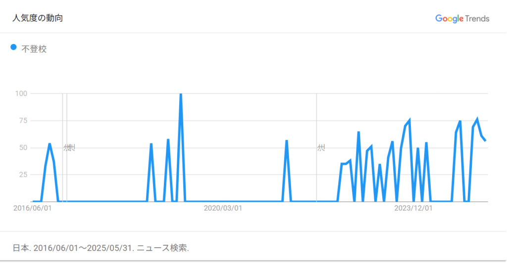 以下は2016年6月1日から2015年5月31日までの10年間にgoogleニュースで「不登校」という単語を含むニュースが配信された件数を月別に表したグラフである。月によりばらつきはあるものの、2021年の終わり頃からは高頻度で「不登校」にまつわるニュース記事が新聞・雑誌・ネットメディアから発信され続けていることがわかる。