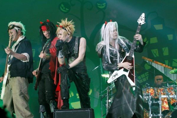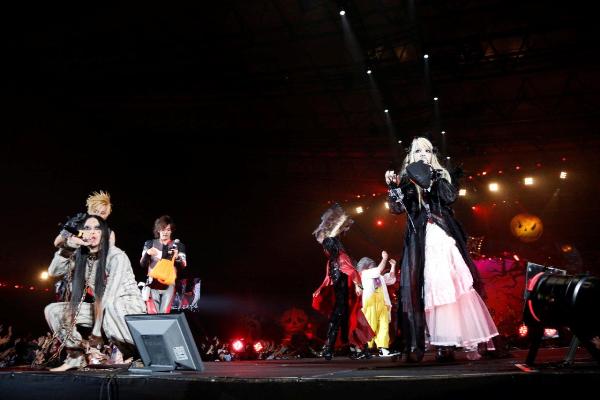 続く3組目はAcid Black Cherry。馬車に乗って登場したメンバーは「FINAL FANTASY VII」のキャラクターに扮して登場。yasu(Vocal)の主人公クラウドはじめ、サポートメンバーのゲームからそっくり抜け出してきたようなクオリティの高いカッコ良い仮装には黄色い大歓声があがる。「1954 LOVE/HATE」からハードな攻めのロックナンバーをクールに次々と披露。中盤では打って変って「ハロウィンにあうカワユイ曲を」とオリジナルグッズのカチューシャをつけたyasuが歌い始めたのは「so…Good night」。左右に揺れながら甘いキャッチ―なポップなメロディを可愛く歌うyasu。ファンは大喜びで曲に酔いしれている。最後は激しいロックナンバー「ピストル」で会場をヘドバンで埋め尽くし、前日とはまた異なる一面を見せ観客を魅了した。