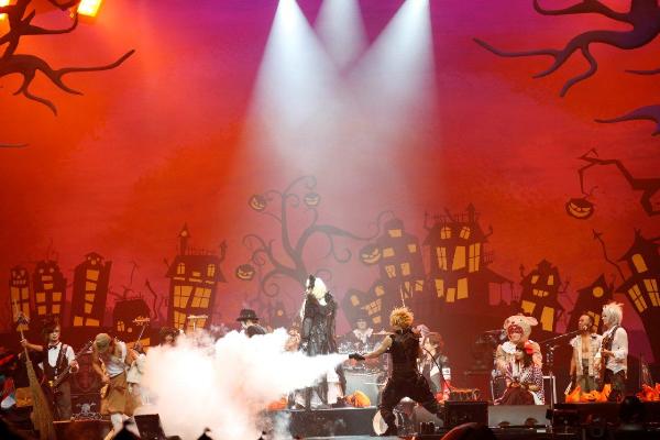 HYDEの唱える呪文に合わせて墓場から次々とゾンビや亡霊、モンスターがステージに沸き上がり、さながらお化け屋敷のようだ。「TOROUBLE」が始まると、カッコよくもおどろおどろしいゴーストたちがうごめいている。会場では円陣を組んで楽しそうに踊っているファンの姿であふれる。そのまま「ANGEL TRIP」「SEX BLOOD ROCK N’ ROLL」とパーティナンバーが続き、最高潮の盛り上がりを見せる!