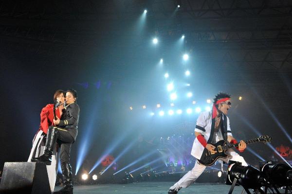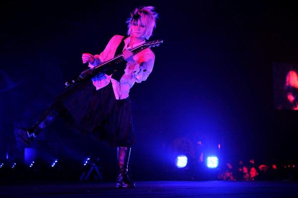 続いてお馴染みのXのライヴオープニングテーマと共に手をクロスにさせながら登場したのはAcid Black Cherry。大歓声に包まれながら、逆毛を立て革ジャンを素肌にまとったyasu(Vocal)は「Murder Licence」などハードなロックチューンを逆立てた髪を振り回しながら立て続けに熱唱。その後「みんなもこの曲を聴きたかったんじゃないかな?」とバラードソング「イエス」の綺麗なイントロが流れファンからは嬉しさのあまり黄色い歓声が起きる!そこから突然モンスターバンドのチェンジ。ファンの大合唱とヘドバンもすごいことになっている。大喝采のなかyasuが「3年連続モンスターバンドをやらせていただいています。神(=HYDEのこと)からのお告げで今年も再びやらせていただきました」と観客を笑わせモンスターバンドの代表曲を熱唱。観客も負けじと夢中になってライヴを盛り上げる。yasuの高く澄んだ声に全くぶれない演奏とここまでモンスターバンドを忠実に再現できるのは、もはや彼らしかいないだろう。最後は「少女の祈りⅢ」のハードでありながら切なさも残るナンバーを攻撃的に演奏し、観客が名残惜しむ熱い声援をあげる中ステージを去った。