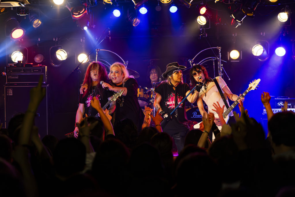 応援団代表を自称するゲストプレイヤーのベースのSEXX GEORGE。その低く構えたフォームから放たれる重低音は、まるでNikki Sixxを想起させながらも、より粘り気のある日本的グルーヴへと昇華されている。