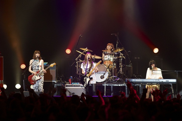 オープニングアクトには、昨年12月に実施された「第4回SCANDALコピーバンド/ヴォーカリストコンテスト」のファイナルで、応募総数550組の中からグランプリとなった久留米の女子中学生7人組バンド・KANIKAPILA(カニカピラ)が出演。SCANDALに憧れている少女たちが、大舞台にも臆することなく550組の頂点らしいパフォーマンスを披露した。