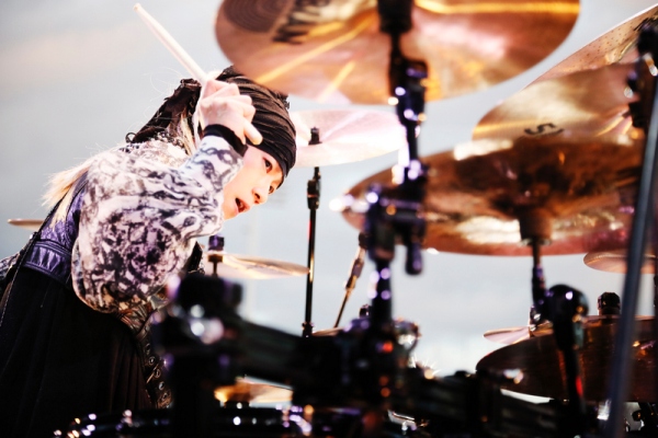 hydeのMCを挟んでのステージは、「HONEY」、「winter fall」、「New World」、「READY STEADY GO」と疾走する大ヒットシングル曲が続く。しかし、会場を熱狂させたのはhydeの言葉通り、メンバー4人による凄まじき演奏力であり、現在形のバンドパワーにある。怒濤の4曲のラスト、yukihiroによるドラムソロには鬼気迫るものがあった。
