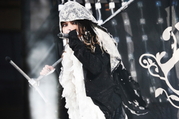 hydeによる最初のMCから、「REVELATION」イントロのコール&レスポンスへ。それに合わせてLEDスクリーンがカウントダウンを印し、数字が“0”になると聖火台に火が灯った。黒いベールを脱ぎ捨てたhydeは、黒地に“L”のロゴが配されたフラッグを掲げ、ライヴが一気に加速していく。