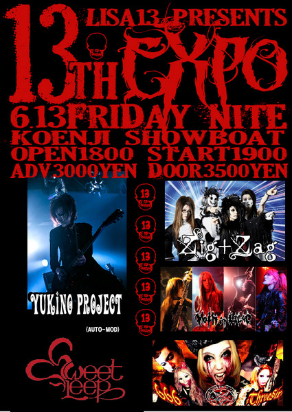 6/13(金)はMoth in LilacのLisa13(Guitar)による初主催イベント「13th EXPO」として開催される。共演者には、AUTO-MODのギタリスト・YUKINOによるYUKINO PROJECTらが名を連ねている。YUKINO PROJECTのメンバーはSEIJI(ephemera)、SHOWY(Bordeaux, AUTO-MOD)、TAKE(LOOPUS, T4R)、YUKINO(AUTO-MOD)というレアな顔ぶれだ。