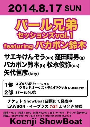 サエキけんぞう(Vocal)、窪田晴男(Guitar)、バカボン鈴木(Bass)、松永俊弥(Drums)、矢代恒彦(keyboard)の5人によるパール兄弟が、昨年に引き続き今夏も高円寺のライブハウスShow Boatにてライブ出演することが決まった。