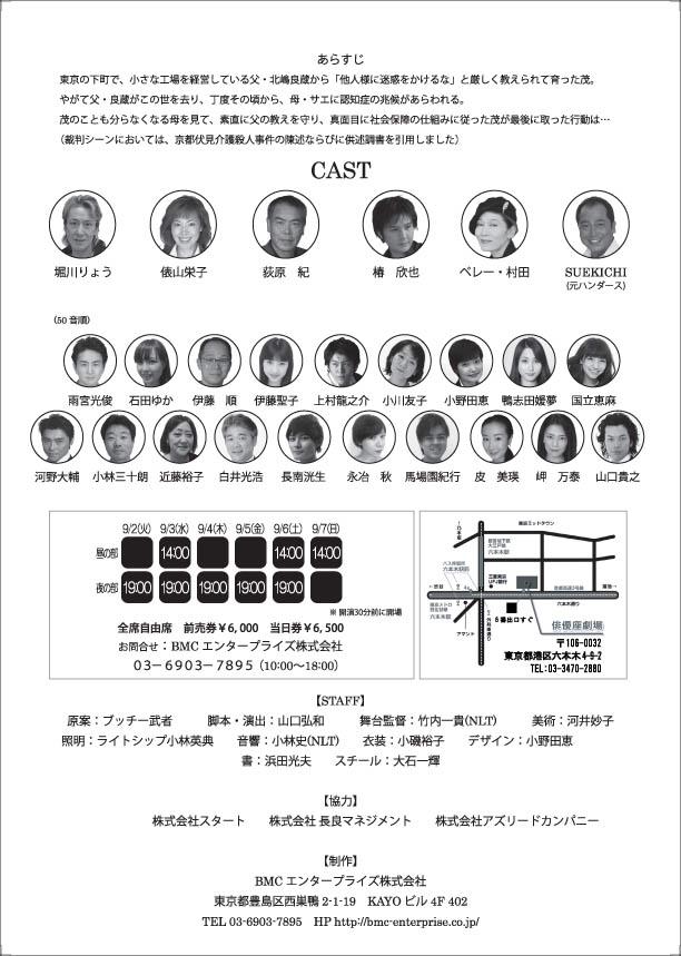 劇団ZANGEの旗揚げ公演として開催される本舞台は、超高齢社会を迎えすべての日本人にとって切実な問題となった介護をテーマにしており、2006年2月に起きたいわゆる「京都介護殺人事件」の実話に基づく問題作。関係者は「介護問題で悩んでる人がいっぱいいるのに、なかなか良い方向に進まない現状を一人でも多くの方に伝えたい。介護や生活保護の現状を作品を通じて伝えるとともに、少しでも光り射す未来を創れるような、そしてキッカケを与えられるような舞台をお届けしたい」とコメントしている。