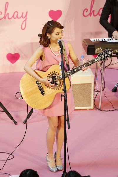 chayは今月18日(水)に発売したニューシングル「あなたに恋をしてみました」がフジテレビ系連続ドラマ「デート~恋とはどんなものかしら~」の主題歌に起用されている。この日のリリースイベントはドラマの舞台でもある横浜ランドマークプラザの1Fガーデンスクエアで開催。ピンク一色のステージに、ピンクのハート風船を持ったお客さんが待ち構える中、chayは60‘sポップスをイメージしたというレトロなピンク色のワンピースに身を包み登場した。