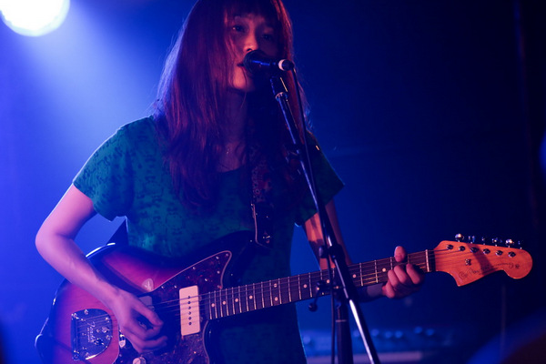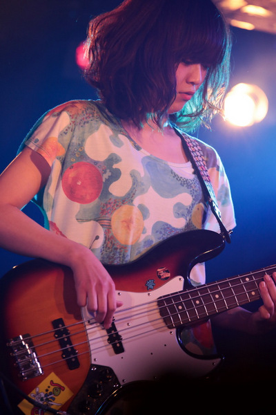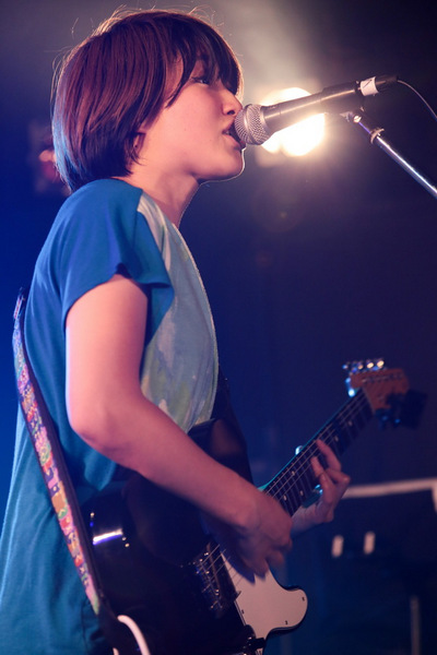 1曲目は「おかしも」。”おさない かけない しゃべらない もう、もう もどれないよ”とユニークな歌詞に、アンニュイな西脇友美の歌声、そしてギターとドラムの素朴な、しかしクリアで耳に心地よく残るサウンドが客席に届けられる。