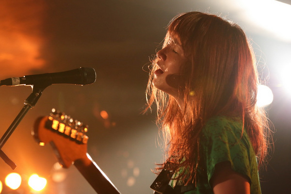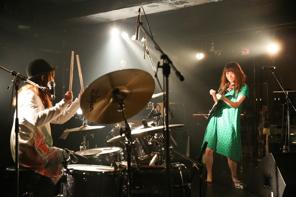 さてChirolの3人がステージを降りると、ステージにじゅうたんが敷かれ、手前にドラムセットが組まれる。ほどなくして、この日のトリを飾るThe nonnonの2人が登場。ハットをかぶるナオ(Drums)が下手に、そして裸足の西脇友美(Vocal & Guitar)が上手にセットし対面すると、演奏スタート。
