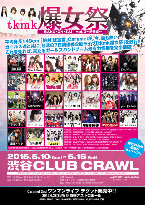 そんなCaramelが主催企画するイベントがこの「tkmk爆女祭vol.0~渋谷編~」である。ラインナップを見ると、たんこぶちん、SORAMIMIなど今勢いのある若手ガールズバンドを中心に、シーンを牽引し続けている不動のガールズバンドFLiPや、田中れいな率いるLoVendoЯ、本誌でもおなじみのCREA、THE LEAPS、MUTANT MONSTER、人気アニメ番組「NARUTO -ナルト- 疾風伝」のエンディングテーマを歌うダイアナガーネットなど総勢31組・100名以上が出演する。