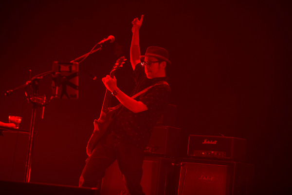 そしてセットチェンジの後、満を持してユニコーンが登場。古いガレージを彷彿とさせるような鉄むき出しのステージに天井からは鎖がかかり、中央にはユニコーンのメタルロゴがセッティングされ、上下に積み重ねられたマーシャルのアンプがまるでAC/DCばりに積み上げられた<ロック>なセットの中、「Loudness」が鳴り響く。ハードロック&ヘビーメタル・テイストの黒いつなぎに身をまとい長髪のウィッグにサングラスを付けたメンバーが登場し、会場は割れんばかりの歓声に。最後に奥田民生ことOTが登場し、最初に演奏したのは新曲「ロック!クロック!オクロック!」。ヘビーなサウンドとステージ上に仕掛けられた火柱の演出で一気に会場のムードがハイテンションに。そしてステージに映しだされたスクリーンにはそんなハードなサウンドと裏腹のいかにもユニコーンらしい洒落っ気たっぷりのシュールな歌詞に笑うオーディンエンスが続出している。