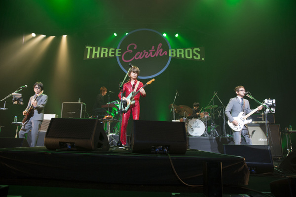 Oしゃんが「この二人が良かったころの曲を…」と言い出すと「終わったみたいに言わないでよ(笑)」とTHE EARTH。名曲「サマーヌード」が演奏され、最初にボーカルを取ったのはOしゃんで、この贅沢なコラボレーションまま「絵」まで終了すると、スパ de SKYがドラムに移動、伊藤大地は<口笛を担当>ということでパートチェンジ。さらにTHE EARTHは何とバイオリンを持って「アースの休日」を演奏し大歓声。地球三兄弟のステージは朗らかなエンタテイメントがそこかしこに散りばめられている。ここで伊藤大地が舞台を降り、Oしゃんがドラム&ボーカル、スパ de SKYがベースを担当して「うかんでいる」を披露すると最後のナンバー「すっごい汗」に。奥野真哉も袖にはけると地球三兄弟のメンバーだけがステージに残った。THE EARTHが「僕もふたりと同じスーツ作ってもらったんですけど、着る機会が無いんですよ」と言いつつ非常にピースな空間を作り上げて地球三兄弟のステージが終了した。