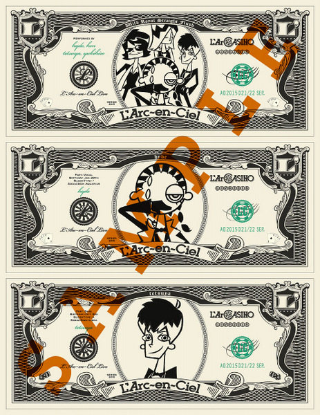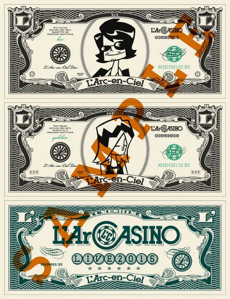 LPサイズパッケージの「完全受注生産限定盤」には、『L’ArCASINO LIVE PHOTOBOOK』と題した24ページのフォトブックが封入されるほか、3形態それぞれに先日大阪にて開催された『LIVE 2015 L’ArCASINO』のライブ演出でも使用されていた「“ラル札”絵柄のステッカーシート」も封入される。ステッカーは全6絵柄がある。