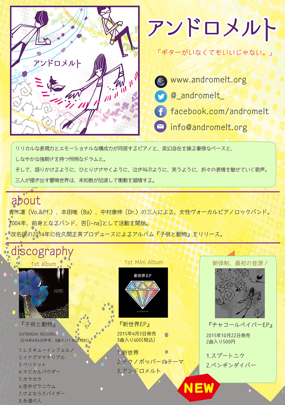 アンドロメルトは青木凛(Vocal & Piano)、本田唯(Bass)、中村康伸(Drums)の3人による女性ボーカルピアノロックバンド。2004年に前身の否[i-na]として活動を開始。改名後の2014年に佐久間正英プロデュースによるアルバム『子供と動物』をリリースしている。
