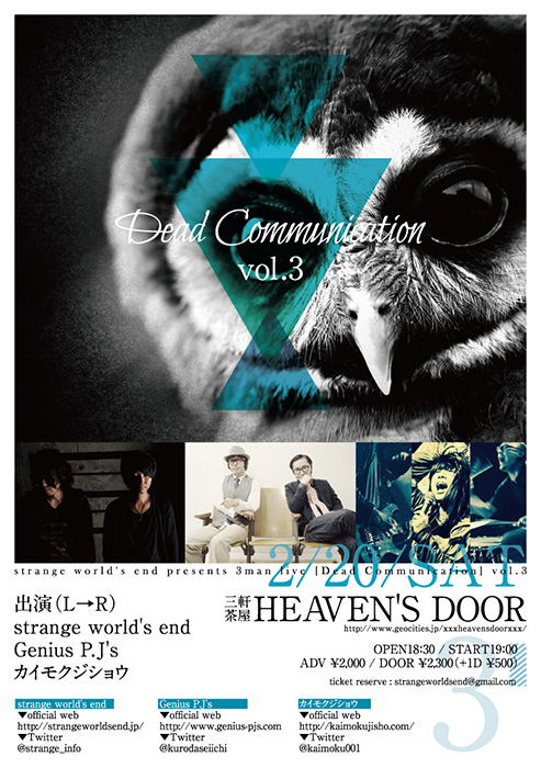 strange world’s endが来年2月20日(土)に自らが主催するスリーマンイベント、「『Dead Communication』vol.3」を東京・三軒茶屋HEAVEN’S DOORで開催する。