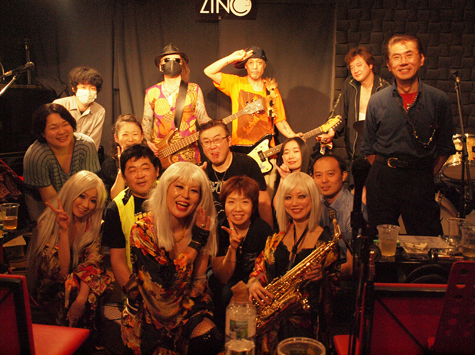 派手なキモノ衣装に黒いコルセット、レザーパンツ、ニーハイブーツ、そしてそれぞれのヘアスタイルの白いウィッグ。お女郎三人、センターにはメインボーカルの清丸、その左右には上手から三味線&ボーカルの菖蒲、アルトサックス&ボーカルの牡丹、並ぶと中々の壮観、ライブバー浅草ZINCの狭いステージが更に狭く感じる(実際狭いのですが)総勢6名。