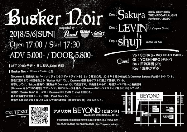 毎回実力と人気をあわせもつスタードラマーたちがゲストとして参加することも注目されている「Busker Noir」だが、関西初開催となる今回のゲストにはLEVIN(La’cryma Christi)とshuji(Janne Da Arc)が決定。活躍する音楽シーンや世代、Pearl Drumなど、共通点が少なくない3人ならではのかけあいが注目される。さらにゲストミュージシャンにはSORA(vo/ex.INO HEAD PARK)、YOSHIHIRO(Gt/ギルド)、田浪真悟(Ba/Z’s)、荒井かずみ(Key)が決定しており、濃密で貴重な夜になること間違いなしだ。