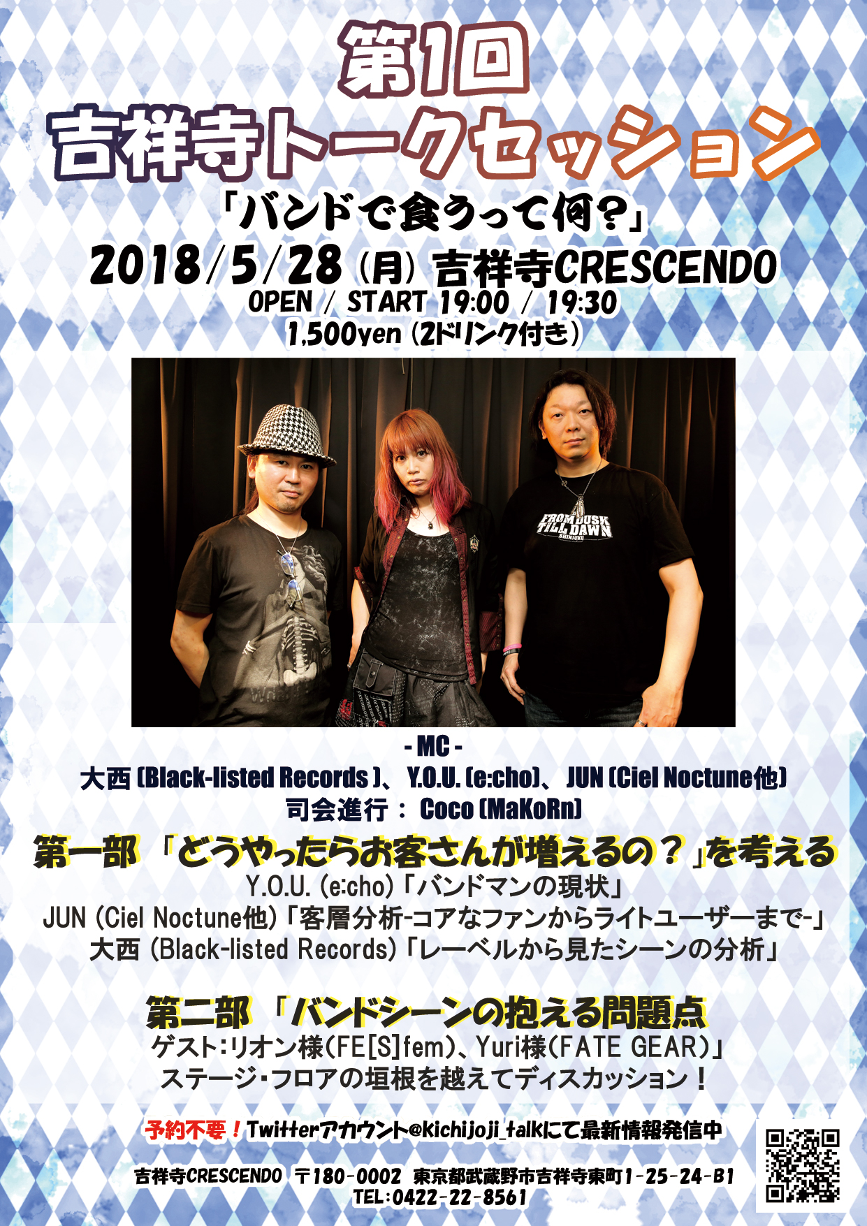 第1部はメタルレーベル「Black-listed Records」の大西祐之代表らが登壇。多方面から「どうやったらお客さんが増えるのか?」を考察。第2部は「バンドシーンの抱える問題点」として、ゲストにリオン(FE[S]fem)、Yuri(FATE GEAR)を招き、ステージとフロアの垣根を越えてディスカッションを行う。