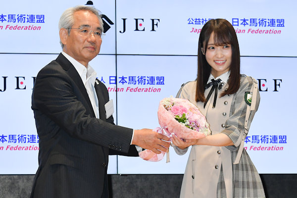 菅井は過去に日本馬場馬術チルドレンライダー選手権で2位に入賞したこともあり、2017年に同連盟の馬術スペシャルアンバサダーに就任。今年3年目を迎えた。アンバサダーとしては同連盟のファンサイト《A to Zinba》内で馬術のQ&A「教えて!ゆっかー」のコーナーを展開したり、馬術関連イベントに出演したりと馬術競技を広くPR。イベント冒頭ではその功績と3年目就任を記念して和田雅雄日本馬術連盟理事⾧から花束が贈呈された。