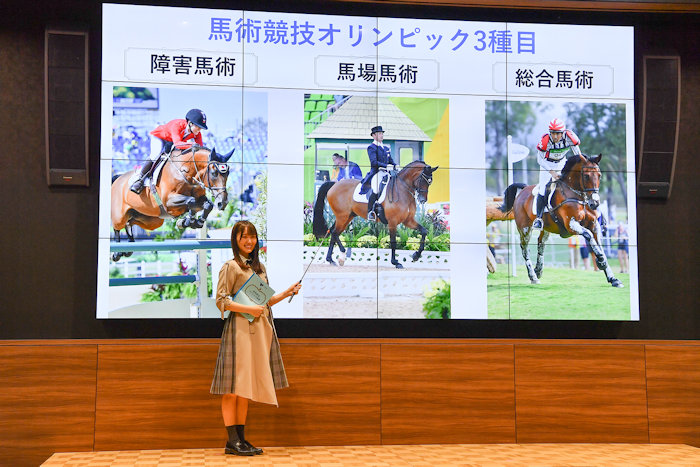 続いて行われた講義では“菅井先生”が馬術競技の概要と魅力を説明。3種類ある馬術競技について解説した。講義の最後は「馬術の魅力は何と言っても選手と馬の信頼関係、それに尽きると思います。オリンピックでより多くの人に馬術に興味を持って頂けるよう、私ももっともっと勉強して馬術の魅力をみなさんに伝えて行きたいです。これからもよろしくお願いします。」と締めくくった。