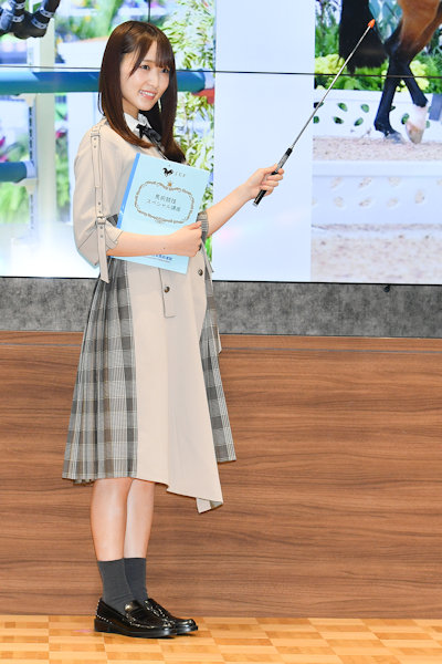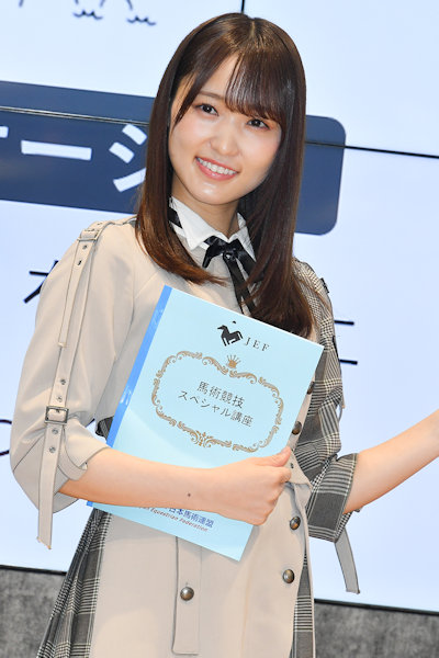 司会者からアンバサダー3年目を迎えた心境を聞かれると「3年目も馬術スペシャルアンバサダーを務めさせて頂くと聞いて本当に嬉しく思います。小さいころから馬がとても大好きで、いつか馬や馬術に関わるお仕事ができたらとずっと思っていました。こういう形で馬術と関わらせて頂くのはとても幸せなことだなと思っています。2020年は馬術が3種類オリンピックで開催されますので、そちらもとってもワクワクしています。これからも馬が大好きなアイドルとして、少しでも馬や馬術の魅力を皆さんに伝えられるよう精いっぱい頑張りたいと思っています」。