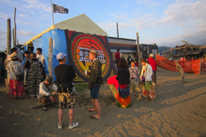 北海道は小樽にある屋外でありながら屋根のある特設ステージ、そこから海に向かっていくと、広いキャンプサイトがあり、このようなロケーションで行われるフェスは、北海道内には他に類を見ない。