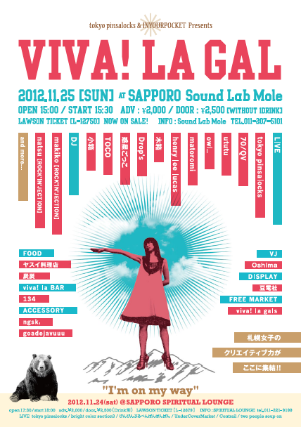 そんなtokyo pinsalocksが、4年ほど前から縁あって何度もツアーに訪れている大好きな街・札幌で聞かれた「札幌でもSpoon Marketのようなイベントを開催してほしい!」という多くの声。その声に応えて、札幌インディーズシーンの代表的イベントINYOURPOCKETとタッグを組んで、今回ついに「VIVA!LA GAL」を札幌で開催!音楽もアートもフードもひっくるめて、札幌の女子のクリエイティブパワーを集結。ライブハウスが入り口から隅々まで、こだわりの空間に大変身する。