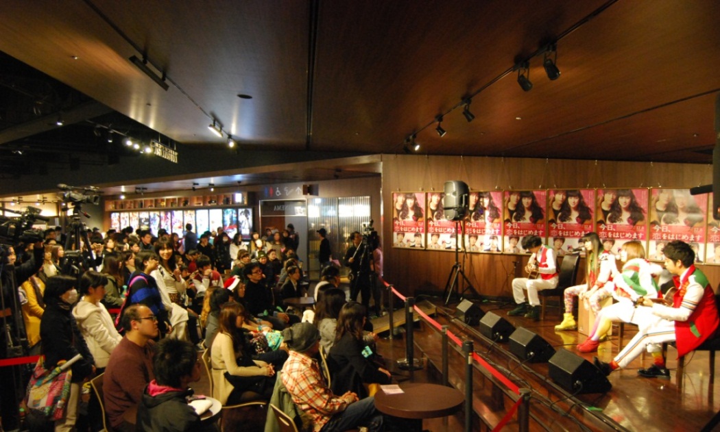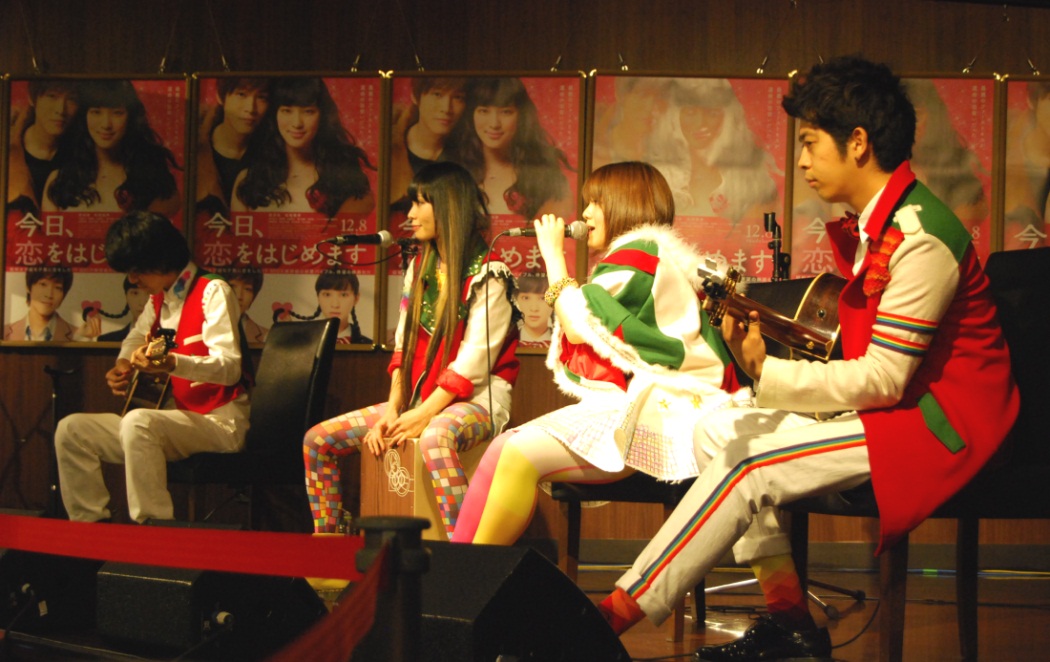 今月公開された、10代に人気の累計900万部突破の少女コミックスが原作、武井咲・松坂桃李主演の映画「今日、恋をはじめます」の大ヒットを記念して、同映画のテーマソングを担当するアーティスト、7!!(セブンウップス)が、12月25日(火)、福岡・JR博多駅直結の映画館「Tジョイ博多」にてライブイベントを行なった。