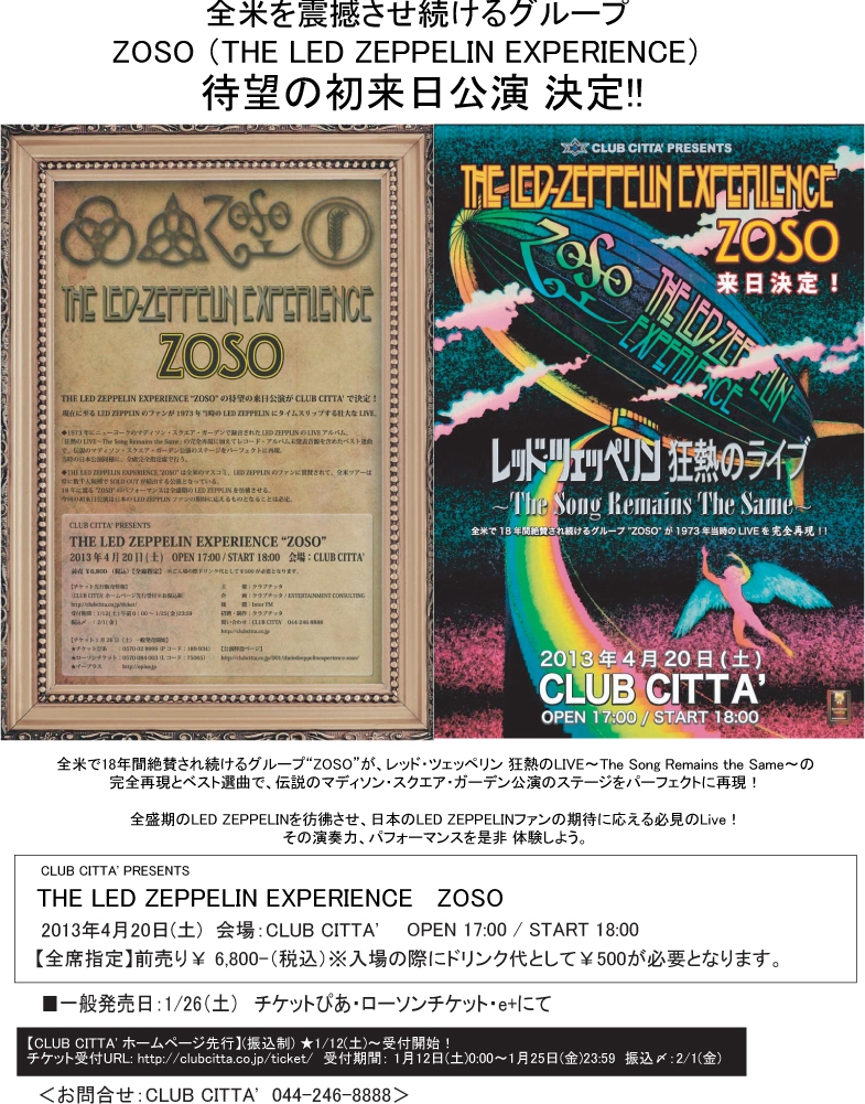 - 【外タレ来るぜ!】4/20(土)ZOSO(THE LED ZEPPELIN EXPERIENCE)公演決定