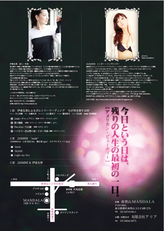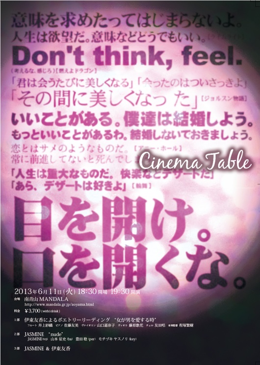 コメント⇒ 詩人、作家の伊東友香さんとジャスミンの共同企画。詳しく聞かされてないんですが映画音楽のトリビュートでしょうか。ちょっと普段と違う感じでオモシロそうです。詳しくはフライヤーをご覧下さい