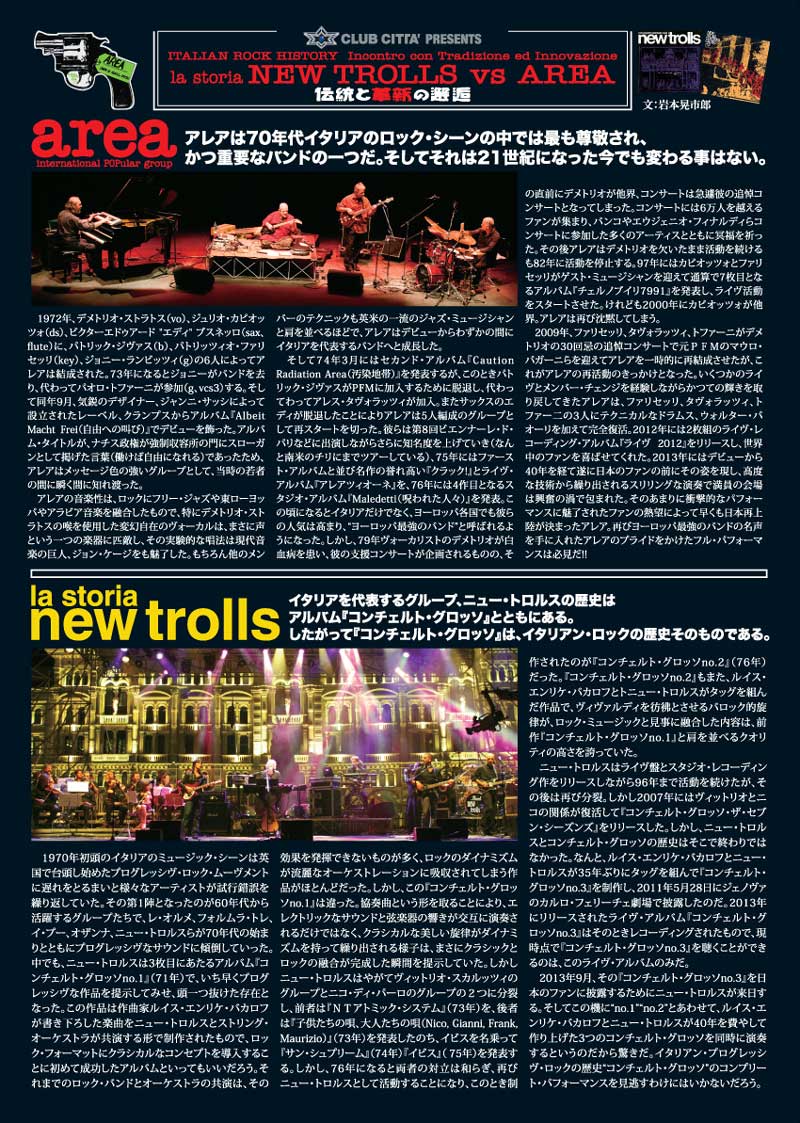 今年9月、「イタリアン・ロック・ヒストリー -伝統と革新の邂逅-」と題したニュー・トロルスとアレアのプレミアム公演が川崎CLUB CITTA’にて開催することがわかった。