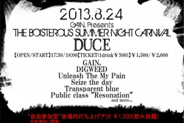 今回出演するのは、DIGWEEDにPublic class “Resonation”。そして、GAIN.企画に初参加となるUnleash The My Pain/Seize the dayTransparent blue/KNOCKSが出演!!