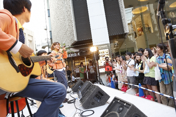 続いて、MICHIRUとKEITAがアコギを手に、MAIKOがカホンを叩くアコースティックスタイルでのライブがスタート!まずは1stアルバム『ドキドキ』の最終トラック、「バイバイ」を演奏。NANAEの美声と穏やかなアコースティックサウンドで、夏休みでいつも以上ににぎわう公園通りに、さわやかな沖縄の風を吹かせた。