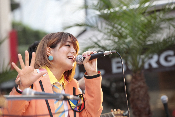 続いて、MICHIRUとKEITAがアコギを手に、MAIKOがカホンを叩くアコースティックスタイルでのライブがスタート!まずは1stアルバム『ドキドキ』の最終トラック、「バイバイ」を演奏。NANAEの美声と穏やかなアコースティックサウンドで、夏休みでいつも以上ににぎわう公園通りに、さわやかな沖縄の風を吹かせた。