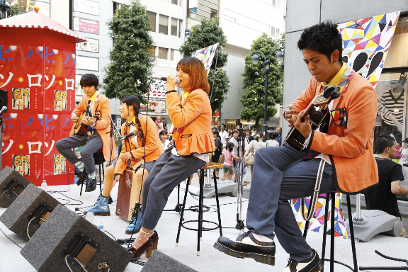 そんな「Jump From Paper」ブランドショップの入る渋谷パルコPART1の1階で、7!!の生演奏が聴けるとあって、特設ステージ前には10代女性を中心に多くの観客が集結。ウップスTシャツとタオルに身を包んだ熱心なファンや渋谷デート中と思しきカップルも足を止めて見守る中、午後4時、MCの女性から紹介を受けて7!!メンバーが登場!「ReReハロ~終われそうにない夏~」のミュージックビデオでの制服をモチーフとした衣装で登場した4人の手には、「Jump From Paper」のバッグが!コラボレーションのきっかけなどを語った。