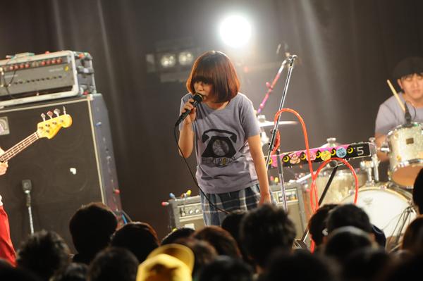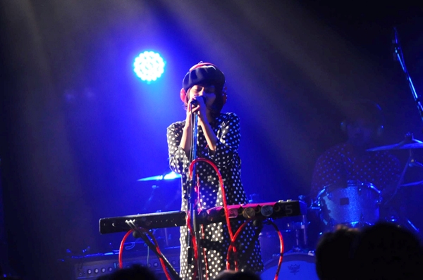開場中のリキッドルームのステージは、電話のイラストが投影された白幕で覆われていて、中の様子は見えず。そして定刻を少し過ぎた頃、電話のベルの音とともに内田万里(vocal & keyboard)の「テレフォンナンバーワン!ツー!スリー!フォー!」という声が暗闇に響き、一曲目の「テレフォン No.1」からライブがスタート。ふくろうずはボーダーの衣装でライブをやることが多く、今回のお客さんもボーダー率が高かったのだが、幕が開いて登場したメンバーは全員ドット柄の衣装。と、そんな肩透かしをオーディエンスに食らわせながら、曲中では電話の小道具を持ち「もしもし東京の皆さん〜○☓♨?%$&#!」と良く聞き取れないながらも客をいじる内田。こうした細かい演出も、本数は少ないとはいえライブを重ねて貫禄が出てきた証だろうか。オーディエンスも大歓声で応える。