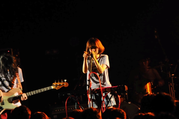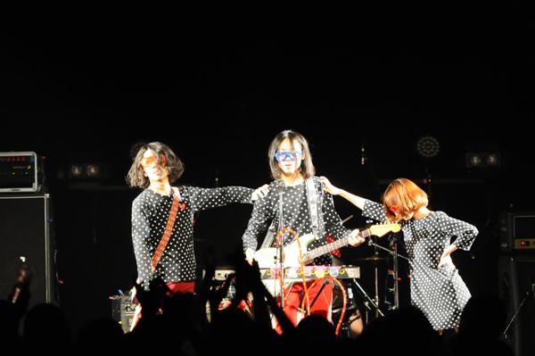 そんな曲の余韻に浸ったのも束の間、再び登場した他のメンバーは、今度は夜店で売っているようなチープに発光するサングラスを着用して登場し、「GINGA GO」という仮タイトルの新曲を披露。ファミレスで「次は銀河じゃね?」みたいな会話から作られたという新曲は、ふくろうず流ダンステクノとも評すべき、安西卓丸(Bass)がパソコンとキーボード、さらにはボコーダーを駆使し、そこに石井竜太(Guitar)の轟音ギターが重なった打ち込みダンスナンバー。曲終わりには、メンバー3人がセンターでポーズを決めたが、果たしてこれは次のアルバムに収録予定なのだろうか。