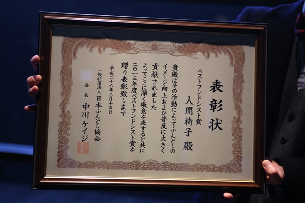 本日・1月18日、人間椅子の東名阪ツアー「バンド生活二十五年 ~猟奇の果~」のファイナル公演が渋谷・TSUTAYA O-EASTにて開催されたが、それに先立ち人間椅子が「BEST FUNDOSHIST AWARD 2013(ベストフンドシスト賞2013)」に選出され、一般社団法人 日本ふんどし協会(http://www.japan-fundoshi.com/)から表彰を受けた。