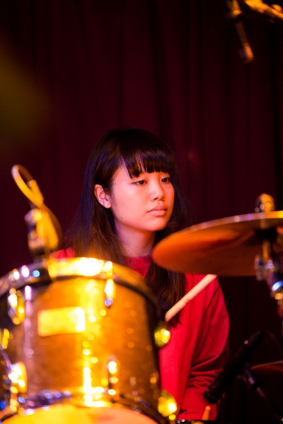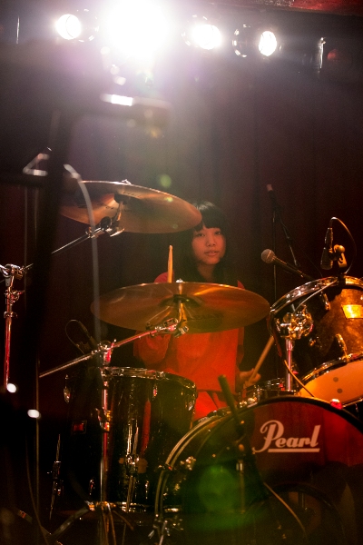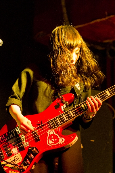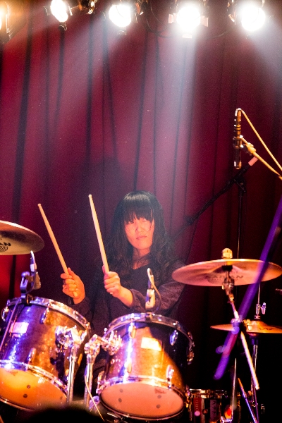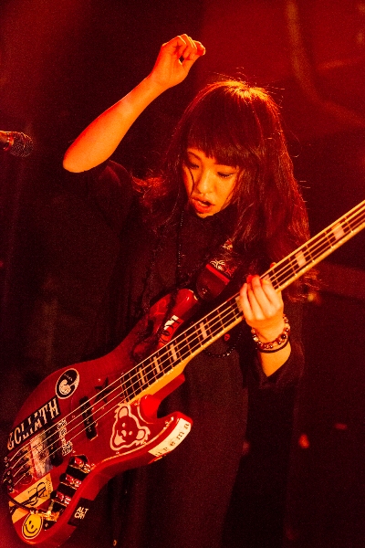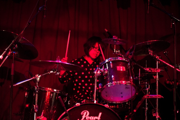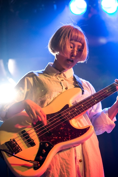 1曲目「好奇の眼(アルバム3曲目収録)」、2曲目「惰性と憂鬱(アルバム3曲目収録)」と、1stアルバム『フカシンリョウイキ』の収録順に進む。ほしいところに着実に決めてくるおみのドラム、泰然と構えるさはらの太いギター、大きな神輿を担ぐように力強く暴れるいちるのベース。いったい小柄な3人のどこにそれほど爆発的なエネルギーが眠っているのか、と毎度ながら驚嘆させられる。