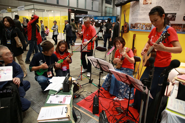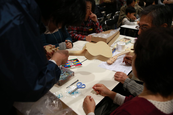 ビッグサイト西1、2ホールをぶち抜きで開催した同フェア。楽器メーカーブース側の西1ホール入口から入場すると、まず目に飛び込んだのは、親子で手作り楽器@ワークショップゾーン。オカリナの絵付け、ウクレレやハモニカの組み立てなど、子供も大人も夢中になって楽しんでいる模様。
