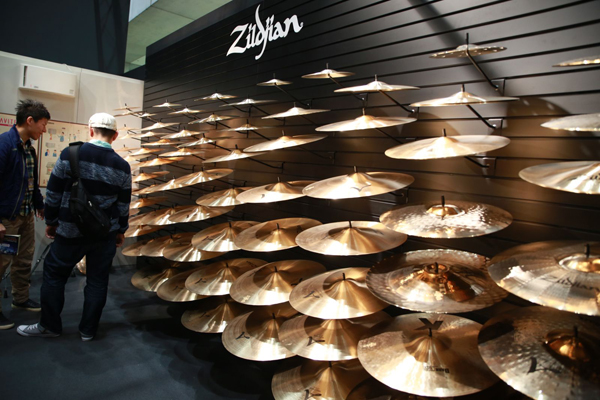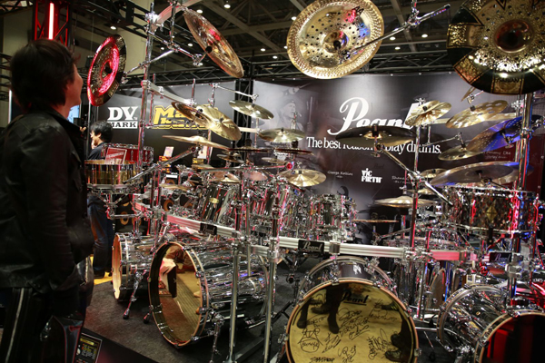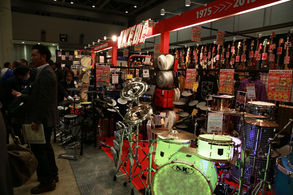 創業周年記念を切り口としたメーカーコラボ企画のドラムやギターなど趣向を凝らした展示販売が目を引いた。販売ブースは、西2ホール側の出入口にゾーニングされていたこともあり、たいへん賑わっていた。