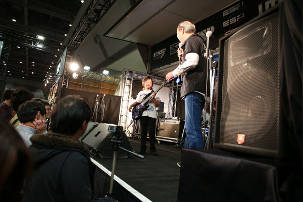 ESPブースの前を通りかかったとき、早弾きのすばらしいエレキギター演奏が聴こえてきた。ブース内の特設ステージからだったが、通路まで人垣があふれ、演奏の主の姿が見えない。演奏終了して、ようやく見えるところにいくと、なんと8歳の男の子。