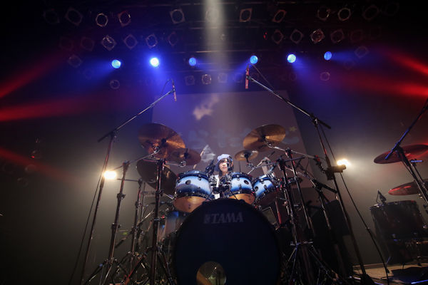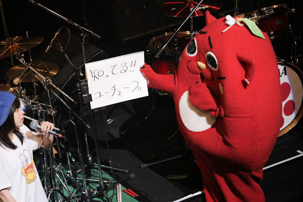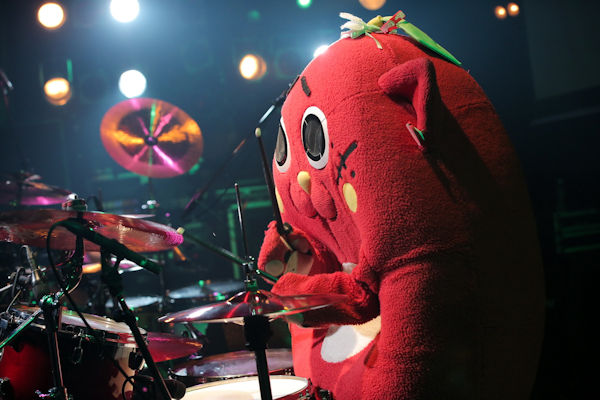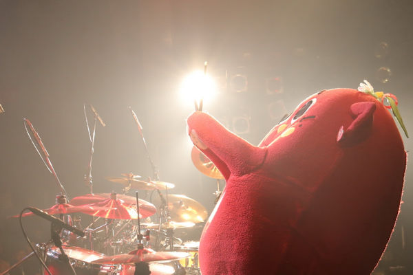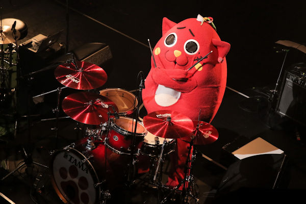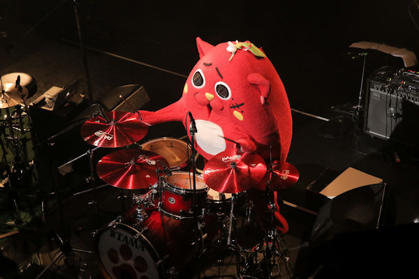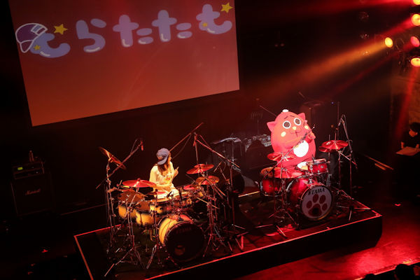 この日のライブの目玉は、にゃんごすたーとの初共演だ。にゃんごすたーとは、青森県黒石市出身の非公認ゆるキャラで、特技はドラム!HR/HMをこよなく愛し、ラウドな楽曲を激しく叩く様がYouTubeにアップされ、話題となっている。一時期、”中の人”がむらたたむなのではないかとネット上で噂されるほど、その実力は目を見張るものがある。
