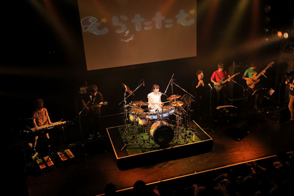 曲が終わると、むらたたむが「靴紐がほどけた」と話し、観客を笑わせる。紐を結んでいると、バンドメンバーが即興で演奏を披露…バンドメンバーとの息もぴったりだ。そして次の曲が明かされると、この日一番の歓声が!